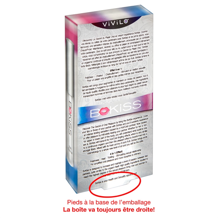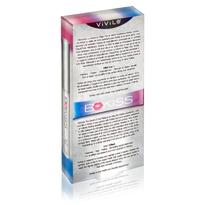 Couvrez vos lèvres ou celles de votre partenaire avec BoKiss et de prime abord, vous éprouvez une sensation intense de chatouillement, provoquée par un contraste Chaud/Froid. Maintenant, recevez ou offrez le plaisir en embrassant intimement votre partenaire. Que ce soit pour elle ou lui, autant pour le haut que le bas du corps, vous comprendrez ce que procure Le Secret du Plaisir Oral. BoKiss transmet cet effet de chatouillement Chaud/Froid, qui est très semblable à un orgasme continuel et ensuite cet agréable effet se transforme en une plus forte libido. Mélangée à son rafraîchissant arôme de pur fruit, BoKiss amène la cosmétologie érotique au rang de l’art et vous en serez l’artiste.